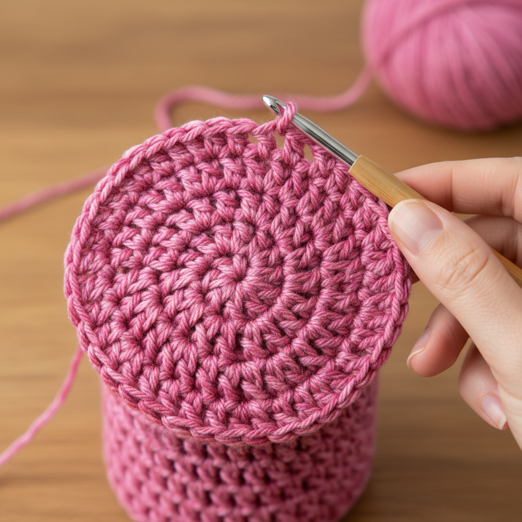 The bottle cover begins with a magic ring, which forms the base of the holder. Start by crocheting 6 single crochet stitches inside the magic ring, then increase stitches in each round to create the circular bottom.