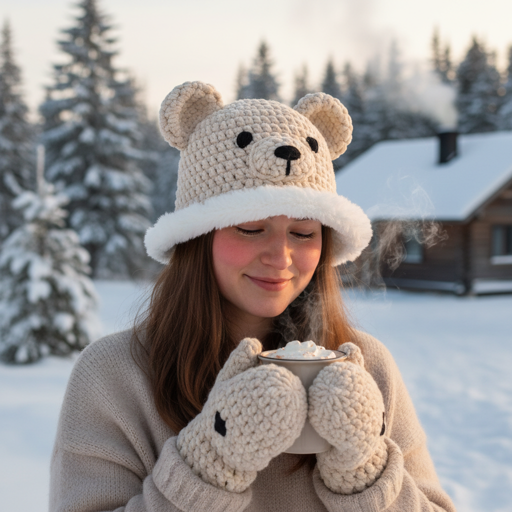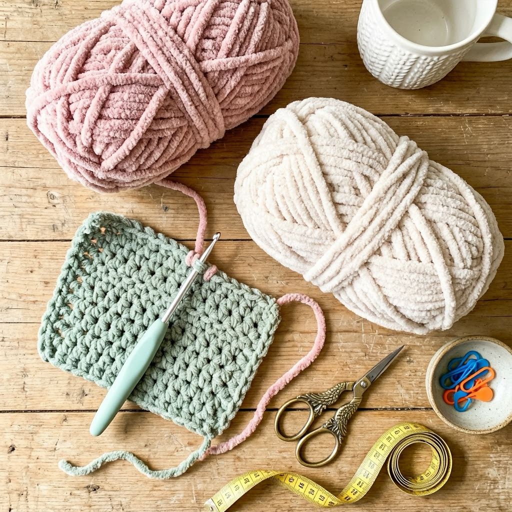 Before starting your crochet bear bucket hat, gather the basic crochet tools and yarn. This pattern uses super bulky plush yarn, which helps the hat work up quickly and creates a soft, warm texture.