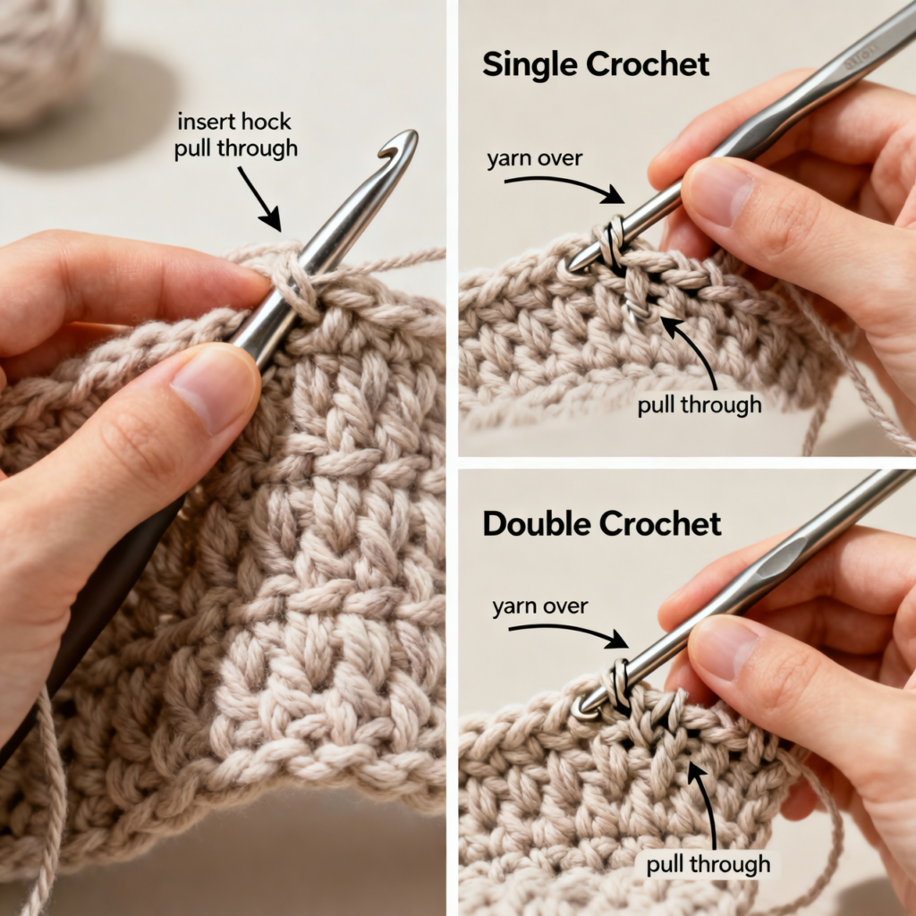 Crochet stitch tutorial showing single crochet and double crochet stitches using chunky yarn.