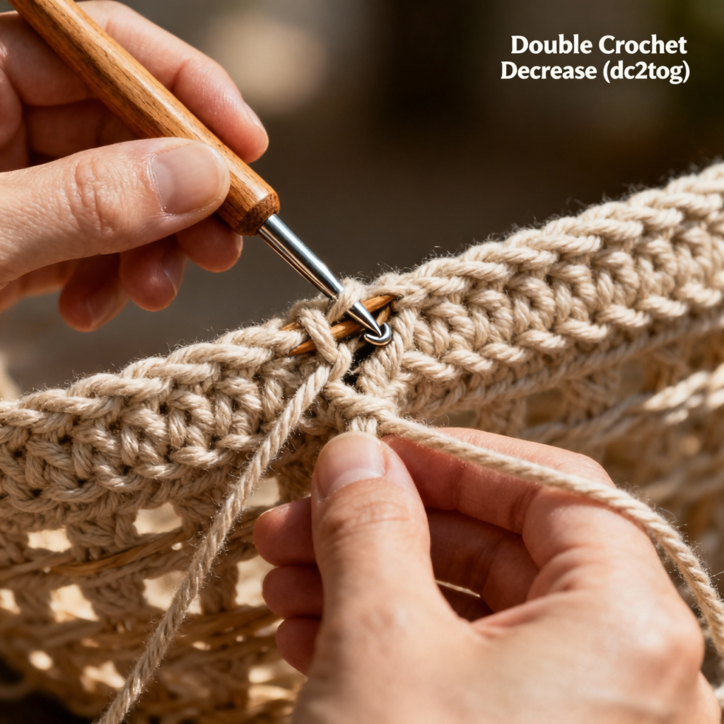 Toward the top of the basket, double crochet decreases are used to shape the rim and slightly narrow the opening.
