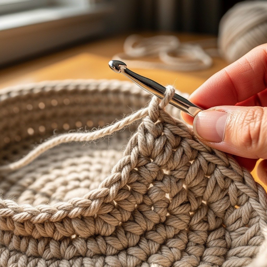 These rounds include chains and double crochet stitches worked around the basket. This technique helps the basket grow quickly while maintaining structure.
