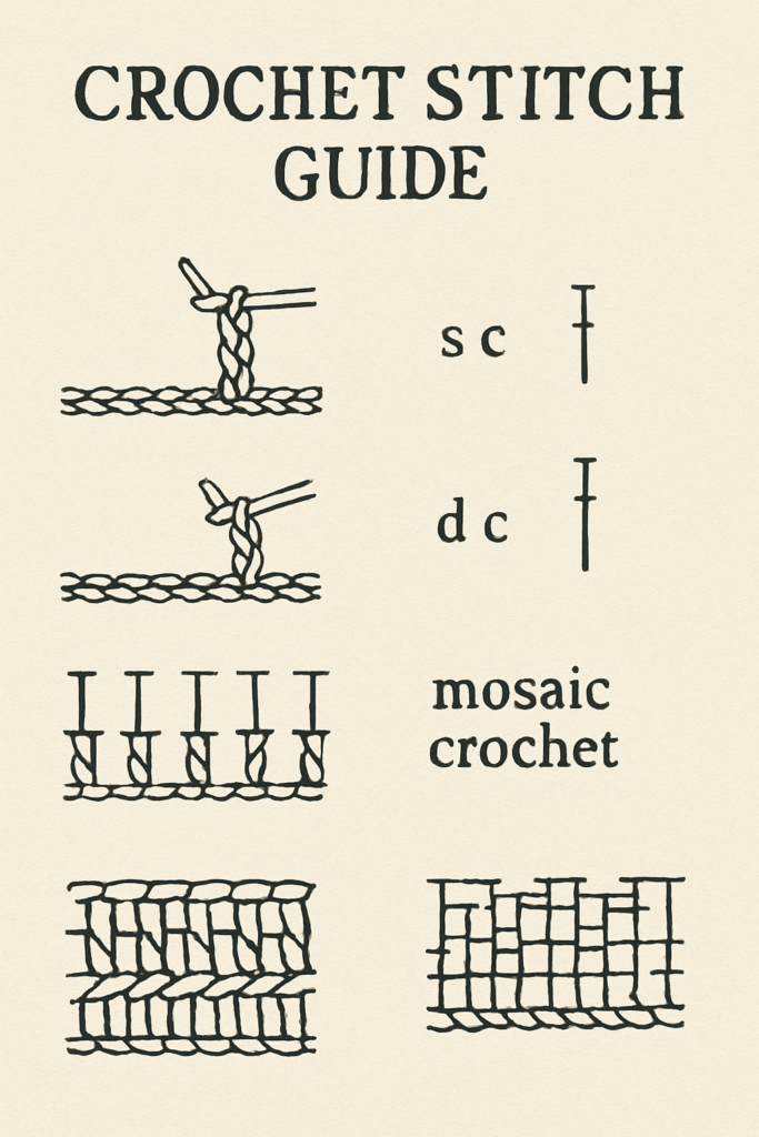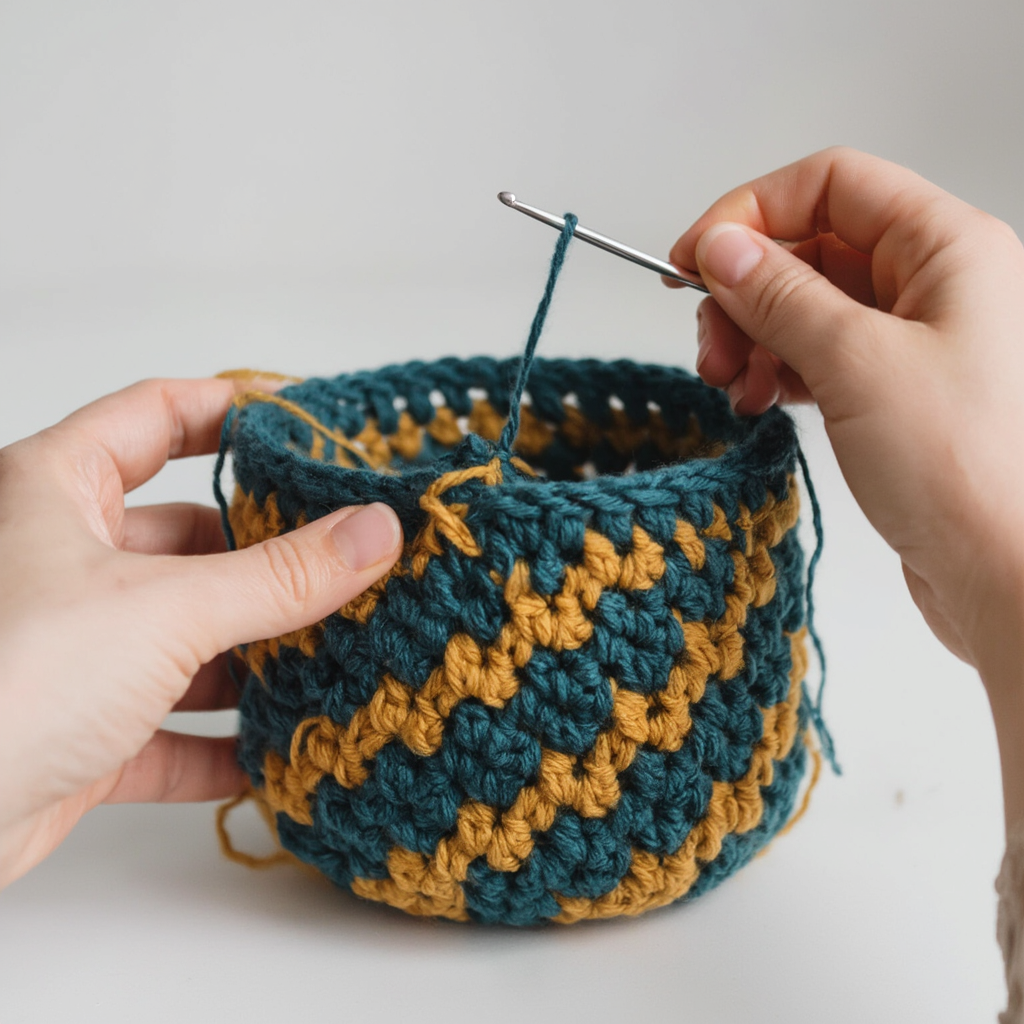 Mosaic crochet creates bold patterns using alternating yarn colors and front-loop stitches. Each round uses a different yarn color while stitches from previous rows form the design.