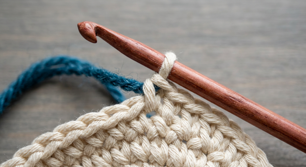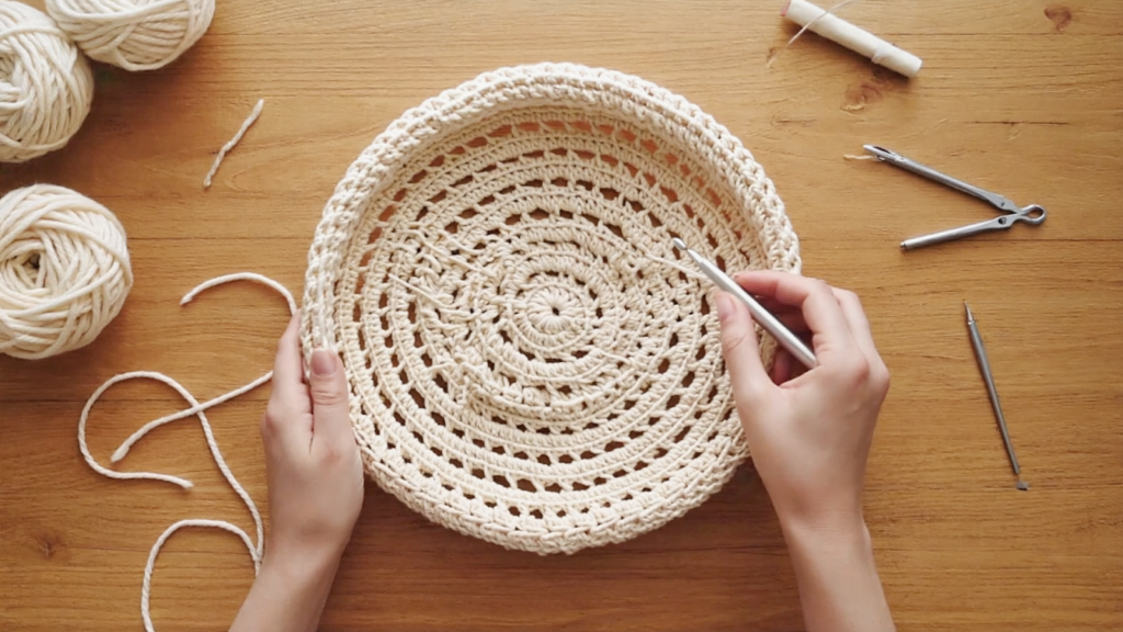 To give the basket a firm and polished edge, the final round uses reverse single crochet (crab stitch).